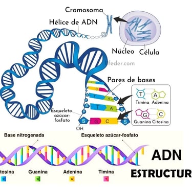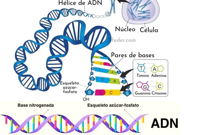 El ADN está compuesto por dos hebras largas de nucleótidos, que se enrollan formando una estructura de doble hélice. Cada nucleótido está formado por una base nitrogenada (adenina, timina, citosina o guanina), una molécula de azúcar (desoxirribosa) y un grupo fosfato. Las bases nitrogenadas se emparejan de manera específica: adenina con timina y citosina con guanina, formando los peldaños de la escalera.